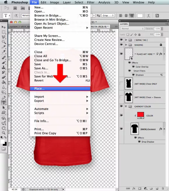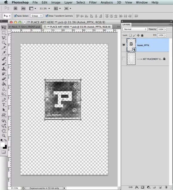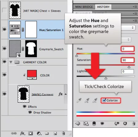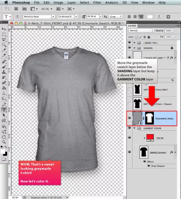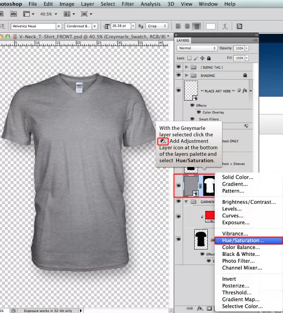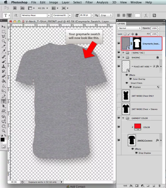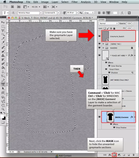 Heather Grey T-Shirt Mockup in 6 steps In this tutorial we show you how to add a heather grey fabric swatch (or any fabric for that matter) to a t-shirt mockup file in 6 super fast steps. Adding a fabric swatch to your template opens the door to even more possibilities with what can be done with an apparel template file. For example, imagine an e-commerce store that sells t-shirts in many different colors (including grey marle). Now, imagine a guest coming to your website and being able to view all the different color options. To set this up would take hours of photographing every different colorway and touching up those photos. Forget the photography, use a template. Nike do it and so can you! Here’s how it’s done. Preview of Final Results What You’ll Need. Grey marle Texture PSD.zip (1200px X 1800px) 2.5Mb Ghosted T-shirt Template Photoshop CS or Newer required. Estimated finish time: 2min. Download this tutorial in PDF format (10.2 Mb) STEP 1: Open the ghosted t-shirt template file Note: All Prepress Toolkit Photo Real Ghosted apparel templates are designed to be used with Photoshop CS or newer software versions. Some PrePress Toolkit Photoshop templates use Smart Object Layers which are only available to users with Photoshop CS3 and newer. For users with Photoshop CS and CS2 you can convert these smart object layers into regular layers. Smart Object Layers are not necessary for this tutorial. STEP 2: Add the grey marle texture Place the grey marle swatch (downloaded from the ‘what you’ll need’ section above) into the photoshop file by going to (File > Place) STEP 3: Masking off the excess You should now see your grey marle swatch at the top of the layers palette. Next, make sure you have the grey marle swatch selected, then holding the Command key (MAC) or the Control key (WINDOWS) click on the [Mask] Garment layer to make a selection of the garment outline. You should see what designers refer to as “marching ants” marching around the outline of the garment (this lets you know you have made a selection). With the selection made, click on the MASK icon located at the bottom of the layers palette. This will mask off the excess parts of the grey marle swatch and reveal the shape of our t-shirt. Your grey marle swatch layer should now look like the below image. STEP 4: Movin’ on down This is the easiest step. Move your newly masked grey marle layer down so it appears just above the layer labelled as GARMENT COLOR STEP 5: Pretty impressive, now lets color it So right now you should be looking at a pretty sweet grey, marle colored, ghosted v-neck t-shirt. The next step is to adjust the color of the grey marle swatch. To do this we need to add a Hue and Saturation layer filter onto the grey marle layer. With the grey marle layer selected, click on the Create new fill or adjustment layer icon at the bottom of the layers palette and select Hue/Saturation. STEP 6: Adjust your heather grey t-shirt mockup Now you will have a Hue/Saturation layer above your grey marle swatch layer. On the settings for Hue/Saturation make sure Colorize is checked. All we have to do now is play with the Hue and Saturation level to get the desired color. In this tutorial we have gone for a red marle color with the Hue level set to 0 and the Saturation level set to 90. Now that was pretty easy! All that’s left to do is add in your owns t-shirt design graphic. Adding your artwork. Let’s add some artwork to your t-shirt design template. For users with Photoshop CS3 simply double click on the **Place art here** smart object layer and copy your artwork into it. TIP: In this smart object layer document there is a layer labelled as Art Placement guide. Turn this layer on to give you a visual guide as to where to place your artwork, but remember to turn the visibility of this layer off before saving the smart object layer document. For users with Photoshop CS and CS2 the smart objects layer will not be available for you so instead simply add you artwork to a new layer below the SHADING layer. Quick Color reference guide Use the below adjustment layer values to quickly make the marle colored ghosted t-shirt design templates pictured below. Ash Marle Hue: 219 Saturation: 0 Lightness: -86 Blue Marle Hue: 200 Saturation: 90 Lightness: 0 Green Marle Hue: 172 Saturation: 75 Lightness: 0 Navy Marle Hue: 219 Saturation: 94 Lightness: -64 Red Marle Hue: 360 Saturation: 100 Lightness: -12 Lavender Marle Hue: 275 Saturation: 74 Lightness: 14 Previous article Free (Time Saving) Screen Printing Job Sheet Next article Top 6 design inspiration web sources for apparel graphic design